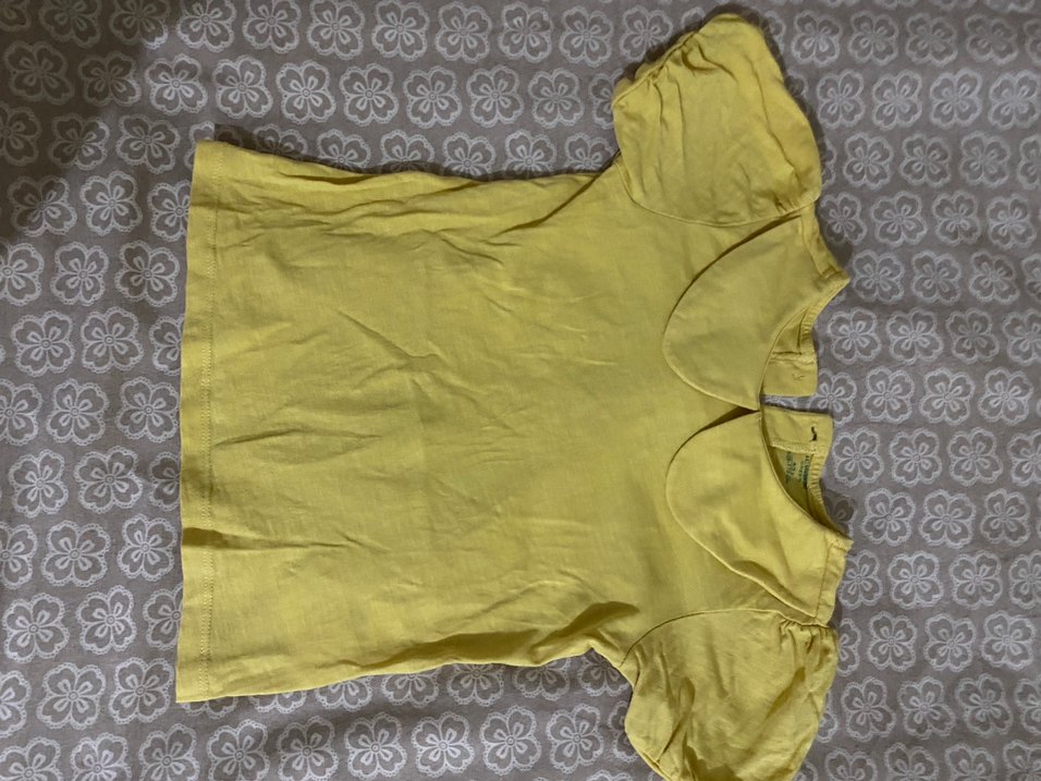 Keten kumaştan yapılmış, sarı renkli, yakalı ve kısa kollu kız çocuk fırfır detaylı ve dar kesim, sokak tarzına uygun.