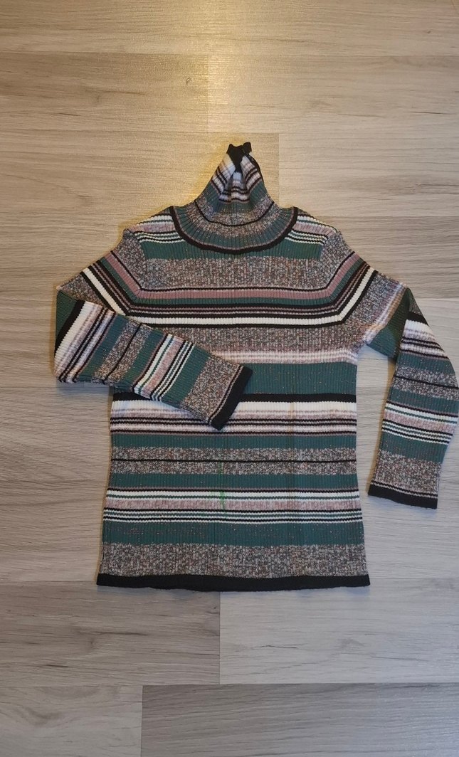 Boğazlı, uzun kollu, çok renkli çizgili ve triko örme, rahat kesim, ışıltılı cocuk kazağı. 1 kez kullanıldı. Yeni gibi. ince triko, çocuğu rahatsız etmez.