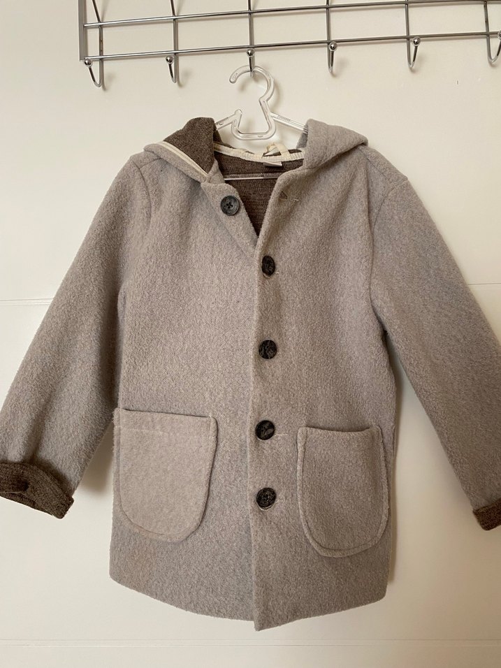 Düğmeli önü, kesik yakası olan erkek çocuk yün kaban. Gri renkte, ceplidir ve rahat kesimlidir. Leke deforme yoktur