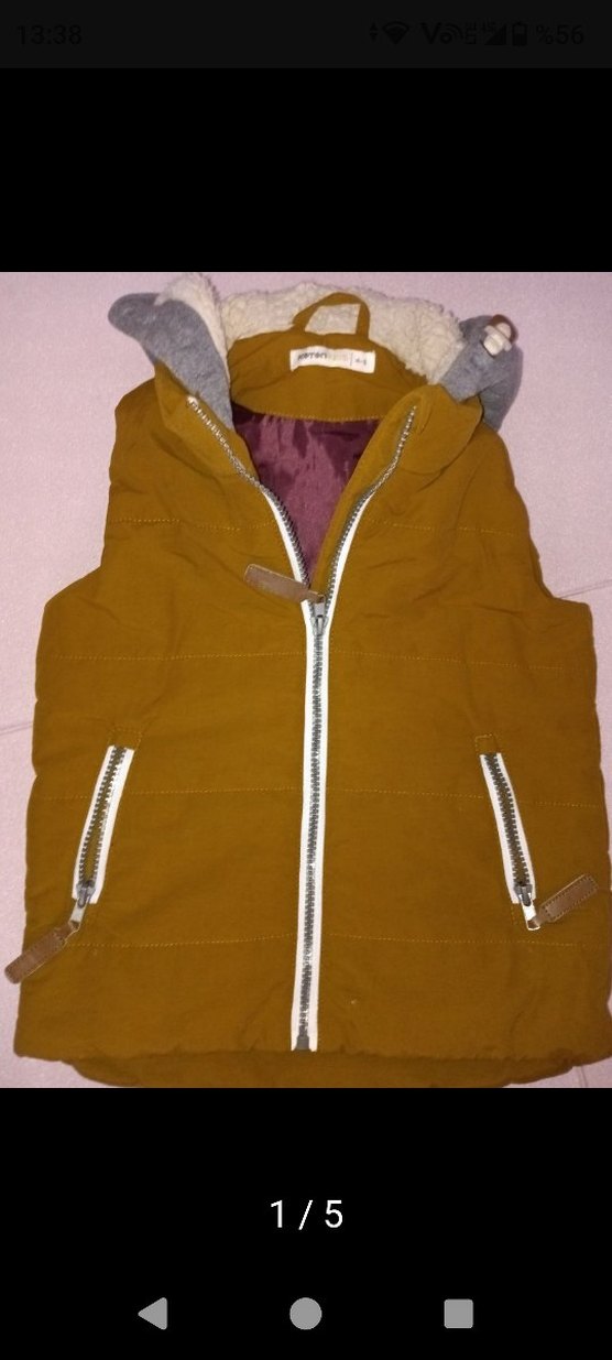 Fermuarlı cepleri ve yüksek yakası olan, kolsuz, yumuşak ve sıcak kumaştan yapılmış yelek. Ürün çok temiz olup hardal sarısı ile açık kahve arası renktedir.