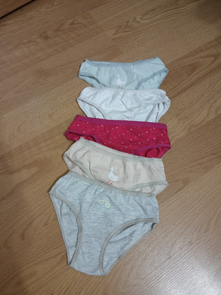 Çocuklar için gri, beyaz, bej ve pembe renklerde 5'li pamuklu külot seti. ürünler iyi durumda sorunsuz hepsının toplam fıyatıdır