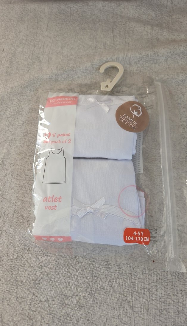 4-5 yaş, 104-110 cm beden, pamuklu yumuşak kumaştan yapılmış 2'li beyaz atlet paketi.