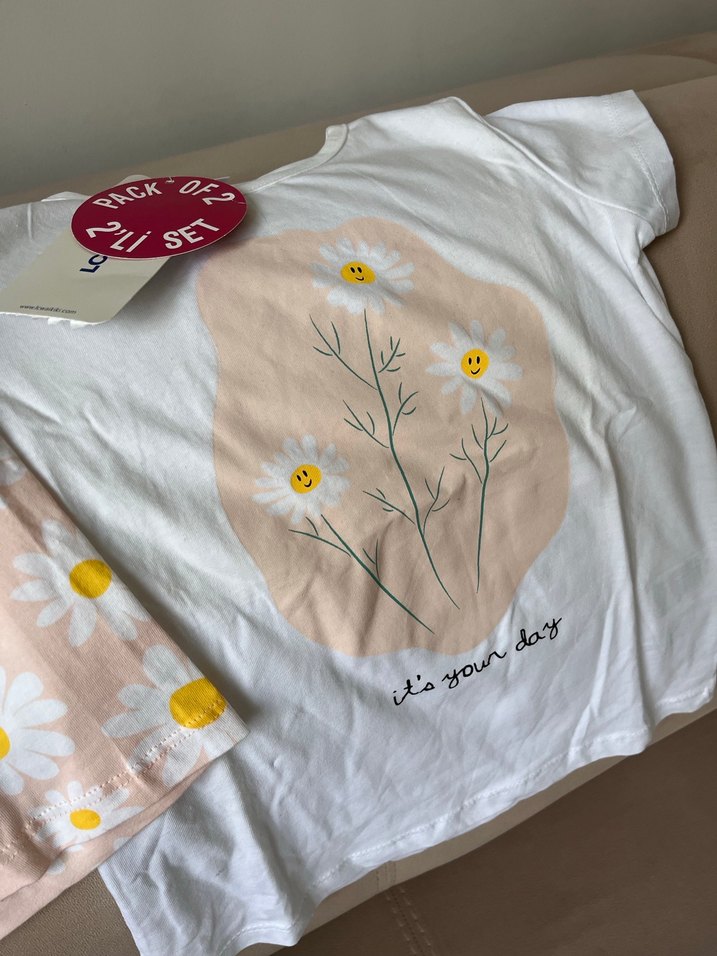 Beyaz pamuklu kız tişörtü, gevşek kesim ve kısa kolludur. Pastel renklerde, neşeli papatya baskılı ve bisiklet yaka tasarıma sahiptir.