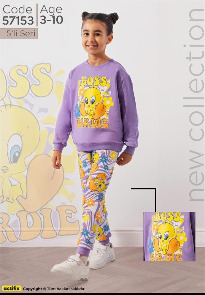3-10 yaş arası kız çocukları için bol kesim, mor pastel renkli, bağlama desenli eşofman takımı. Bisiklet yaka, uzun kabarık kollu, pop art baskılı.