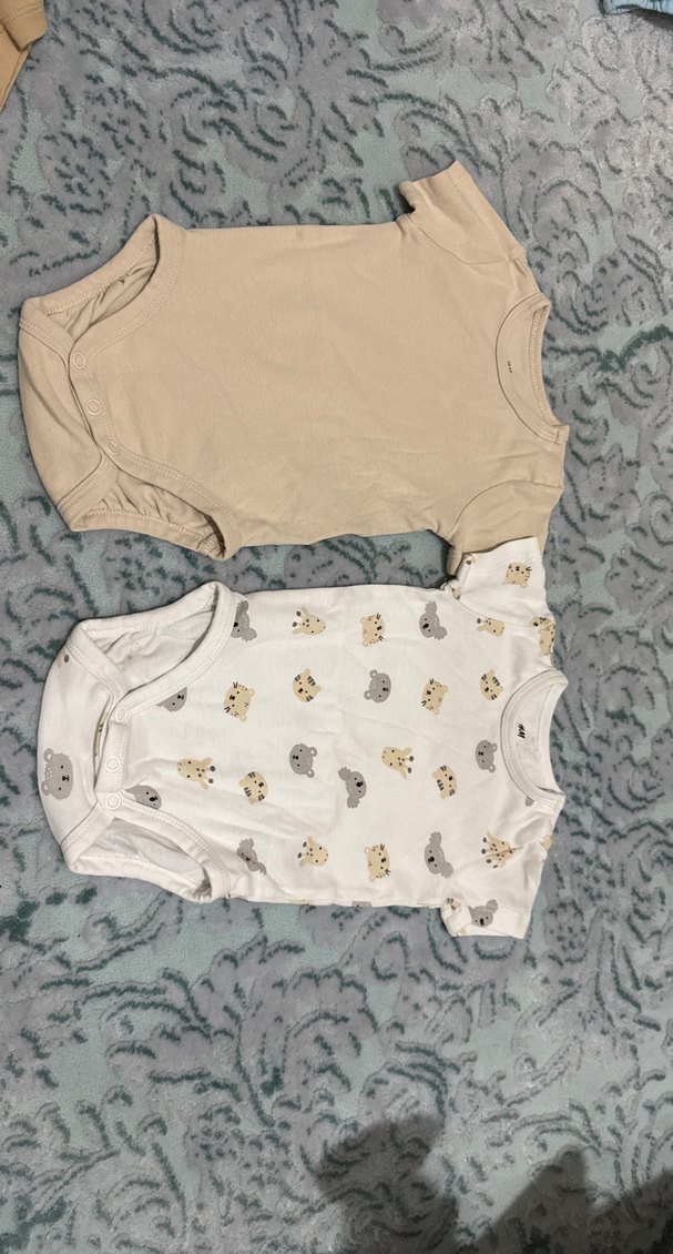 4-6ay. İki adet kolsuz pamuklu erkek bebek body, biri pastel kahverengi diğeri hayvan desenli. Her ikisi de askısız yakaya ve kolay çıtçıt kapamalara sahip. Çok iyi durumdalar.