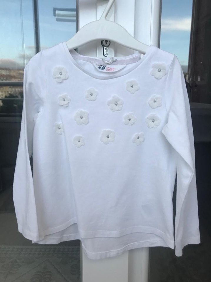 Kız çocuk beyaz uzun kollu pamuklu tişört, düğmeli çiçek detaylarıyla, salaş kesim ve bisiklet yakalıdır. Street wear tarzına uygundur.