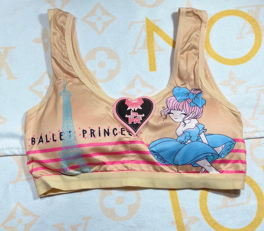 Bej renkli, pastel tonlarda baskılı prenses desenli atlet. sevimli karakter ve Eyfel Kulesi motifi içerir.