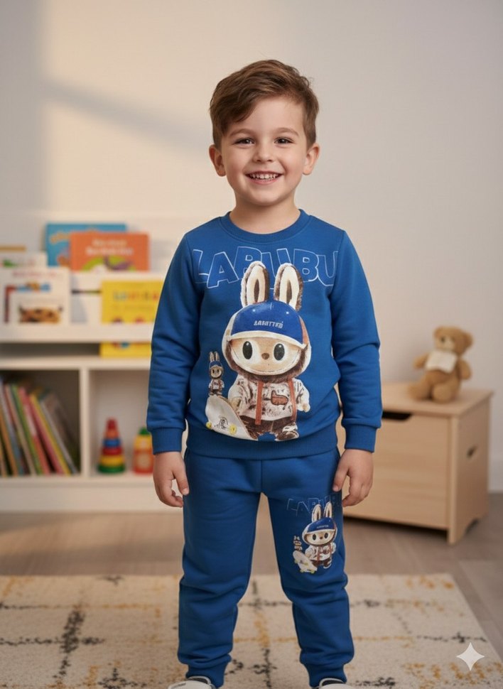 Lacivert baskılı, kapüşonsuz, rahat kesim erkek çocuk eşofman takımı, yumuşak ve sıcak kumaştan, Velcro detaylıdır.