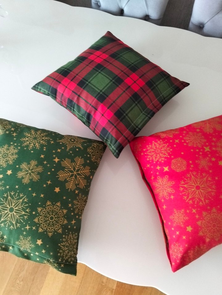 Renkli ve desenli yastık kılıfları, kareli ve kar tanesi desenleriyle canlı bir atmosfer yaratır. ️