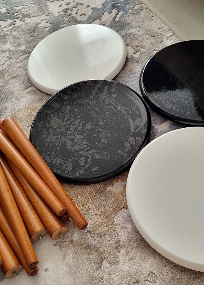 Çok sağlam tok ahşap sehpalar. 1 tanesinde saksı koyduğum için çizikler olmuş siyah boya ile boyanır. Hepsi aynı boy. Kırıkkale de. Kargo agır gelir.