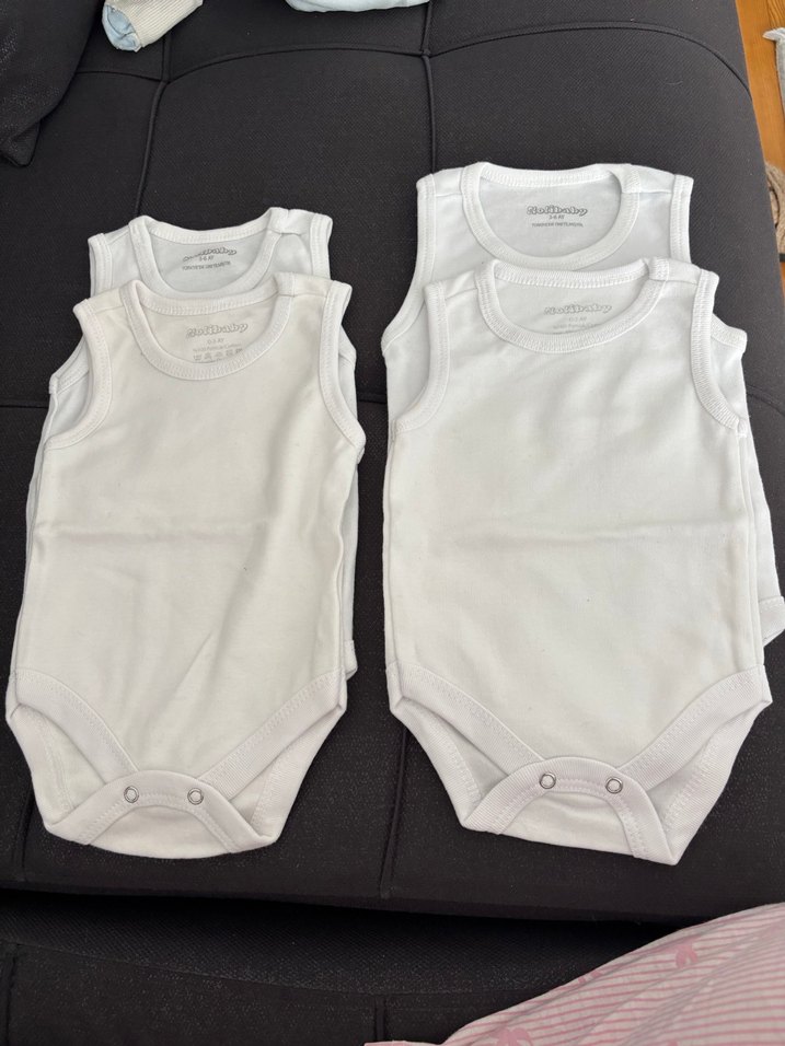 4 adet Bebek kolsuz, beyaz pamuklu bodyler, straplez yakalı ve desensiz, rahat sokak stilinde tasarlanmıştır. 2 adet 0-3 ay 2 adet 3-6 ay olmak üzere toplam 4 adet sıfır ürün hiç kullanılmadı sorunu yok. #zıbın #body