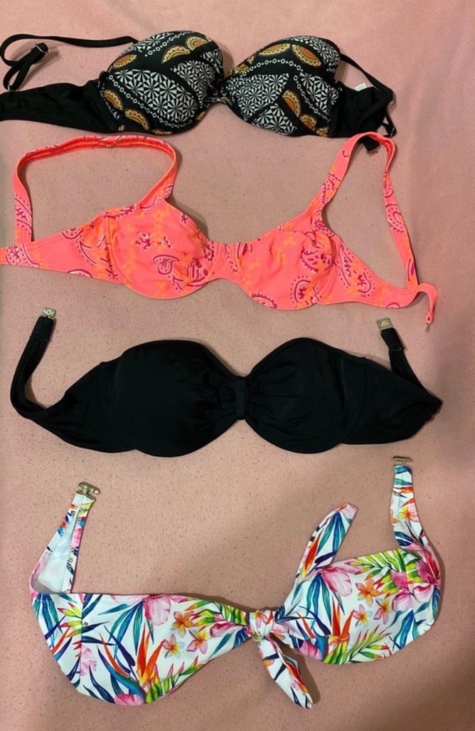 Dört adet tokalı, desenli ve ince askılı kadın bikini üstü, canlı renklerde ve sıkı kesim, plaj için uygun. 36 -38 ve 40 bed 4 lü olarak satılacak..