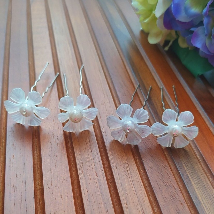 4 adet beyaz çiçek desenli topuz tokası. 1 kere düğün için kullanıldı, yeni ve sağlam durumda. İçlerinden bir tanesinde çok hafif defo var o da saç içine geleceği için dışarıdan gözükmeyecek. Son görselde belirttim.
