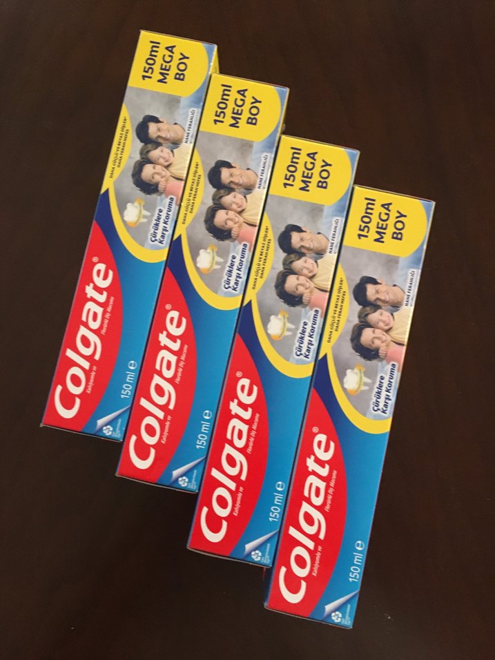 Colgate diş macunu 150 ml mega boy, 4'lü pakette. Etkili temizlik ve ferah nefes .orijinal sıfır ürün.görseldekilerin hepsi birlikte.