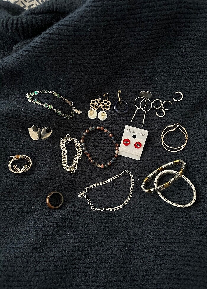 6 ürün fiyatıdır. Tekli satmıyorum. Earcuffların sondaki ikisi çelik olabilir ama tam hatırlayamadım fiyatı zaten çook uyguna koyuyorum. İkincisini kullandım sadece bir iki kere. Biraz kuvvetli baskı uygulayarak hepsini sıkıştırabilirsiniz kulağınıza. Diğerleri çelik değil. Bileklik beyaz gümüş değil sarımsı yansımaları var. Hiç kullanmadım. Halhal beyaz gümüş renkli, hiç kullanmadım.