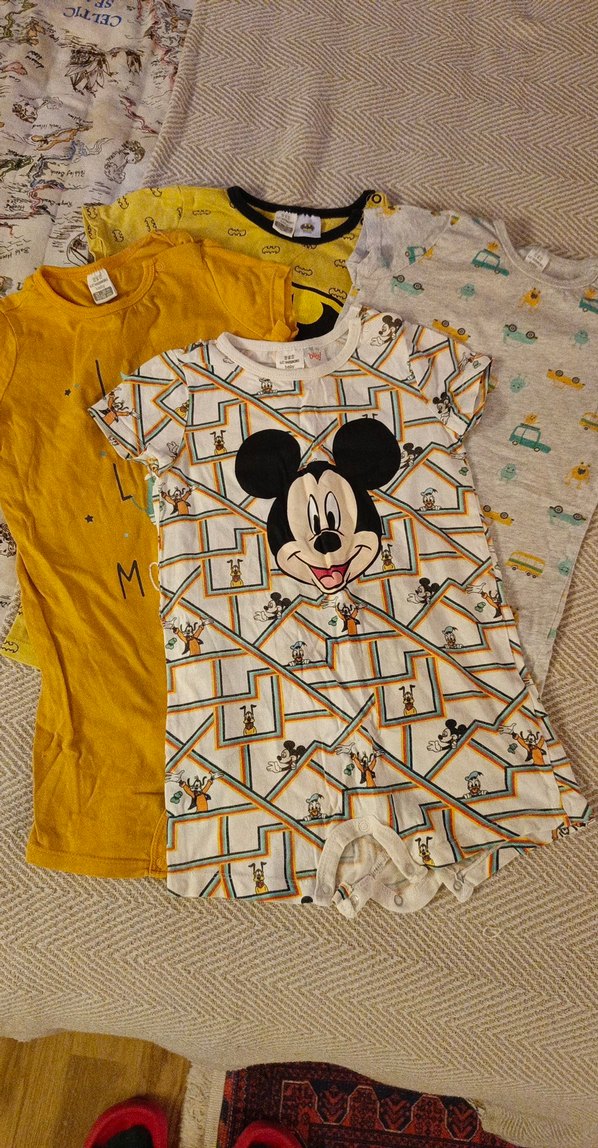 Kısa kollu, canlı renkli Mickey Mouse desenli, pamuklu bebek tulumu. Düğmeli ve bisiklet yaka detaylıdır. Pop kültür stilini yansıtır. Sadece turuncu olanda ufak bir leke var oda çıkabilir belki bilemiyorum, onum dışında hepsi çok iyi durumda cırtları sağlam yırtık sökük yoktur. Hepsi 24/36 ay uyumlu.