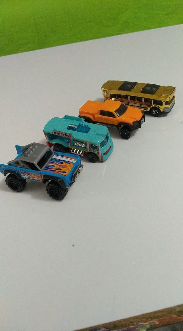 Mavi alev desenli kamyon, turkuaz minibüs, turuncu SUV ve altın otobüs içeren renkli oyuncak araba seti. Her biri detaylı tasarımlara sahip.
