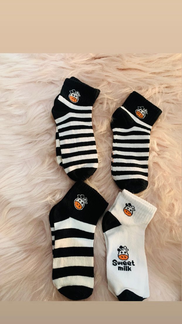 Yumuşak kumaşlı erkek çocuk çorapları, zebra çizgili koyu ve beyaz renklerde. Her birinde sevimli inek yüzü ve 'Sweet milk' yazısı bulunur.Mağaza ürünüdür sıfırdır✅ 35-38 NUMARA ARASI UYGUNDUR