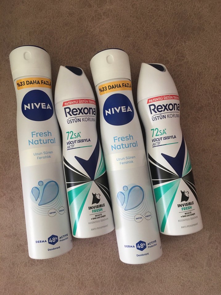 Nivea Fresh Natural 200ml.ve Rexona Invisible Fresh deodorantlar, uzun süre ferahlık ve 48 saat koruma sağlar. Vücut ısısıyla aktifleşir. orijinal sıfır ürün.görseldekilerin hepsi birlikte.