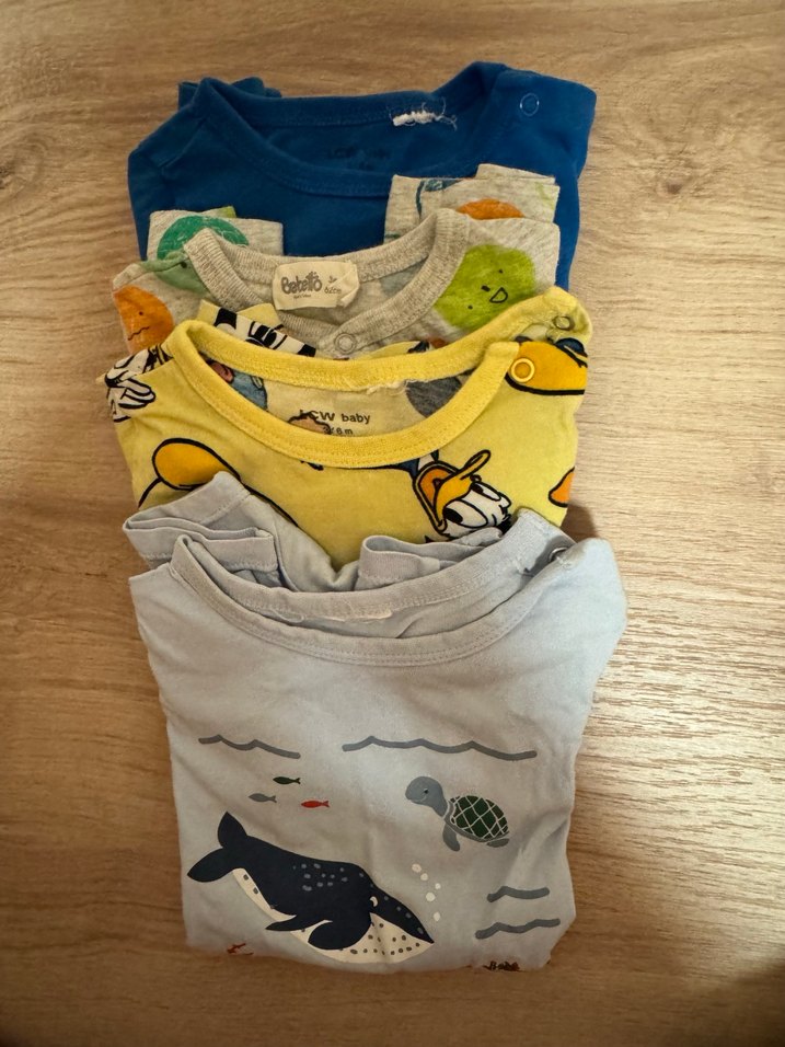 Yumuşak pamuktan kısa kollu erkek bebek bodyleri, baskılı desenler ve yuvarlak yaka ile. Kolay giydirme için cırt cırtlı kapanış içerir. Gri ve diğer renklerde.