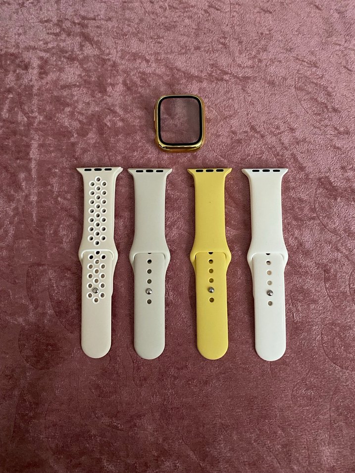 Sarı ve beyaz renklerde, farklı bilek boylarına uygun akıllı saat kordonları ve çerçevesi seti. ⌚