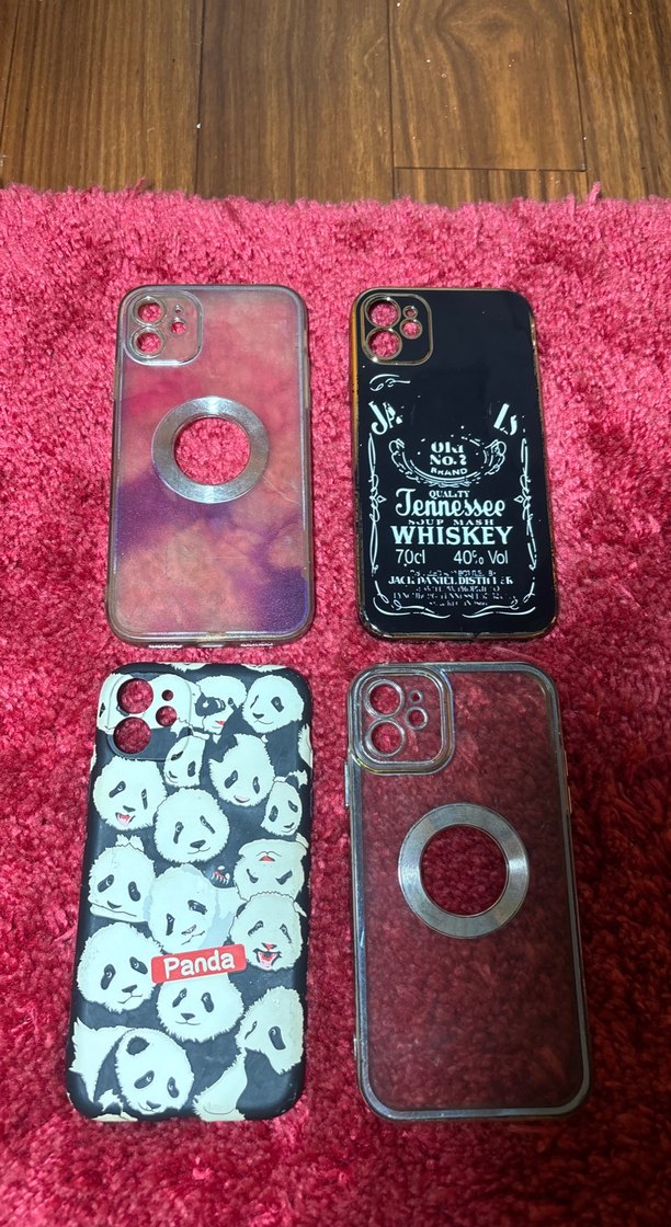 Parlak yüzeye sahip, koyu ve çok renkli gotik ile panda desenli telefon kılıfları. Birinde whiskey etiketi yazısı bulunur.