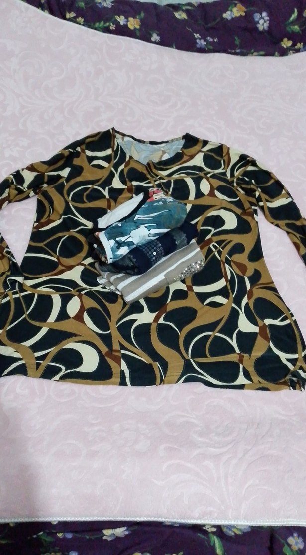 3 adet kısa kollu üst 1 adet uzun kollu likralı üst esneyen kumaştan hepsi 2 tanesi taşlı süslü bir tanesi kuş şeklinde parıltılı yırtıkları vesaire yok uzun kollu olan likralı 1-2 beden daha büyüyor yani yıkayıp rahatladı hepsini giyebilirsiniz.