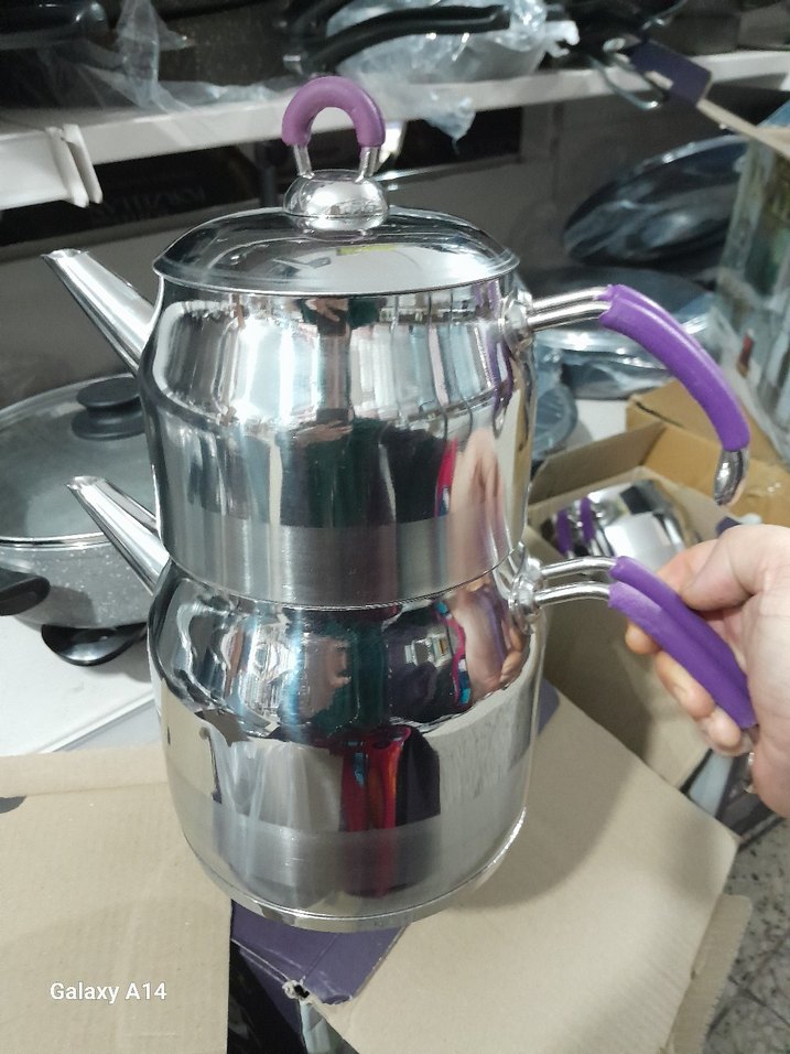 Parlak paslanmaz çelik gövdesi ve mor kulpları ile dayanıklı ve şık bir çaydanlıktır. ☕