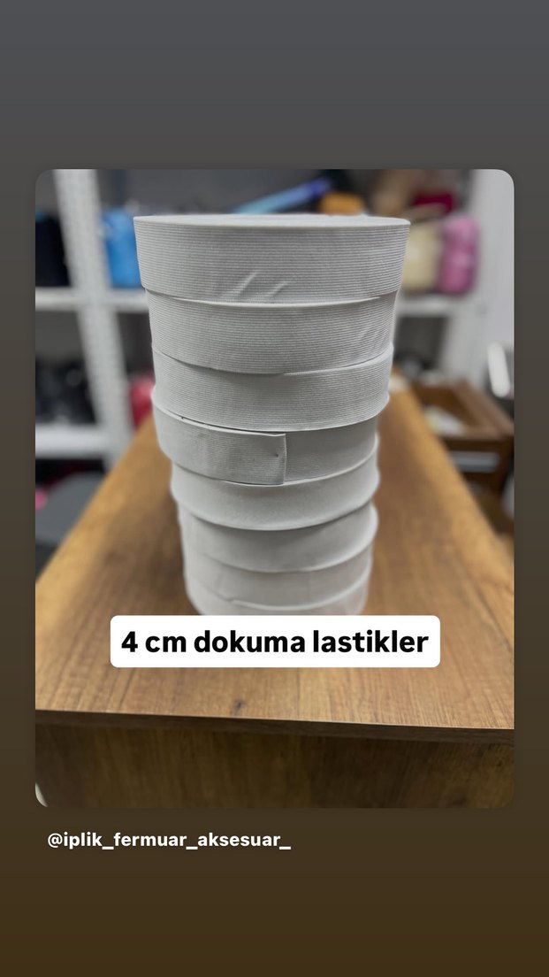 4 cm genişliğinde beyaz dokuma lastikler, çeşitli kullanımlar için uygundur. Üzerinde baskılı doku ve gri tonlar bulunur.
