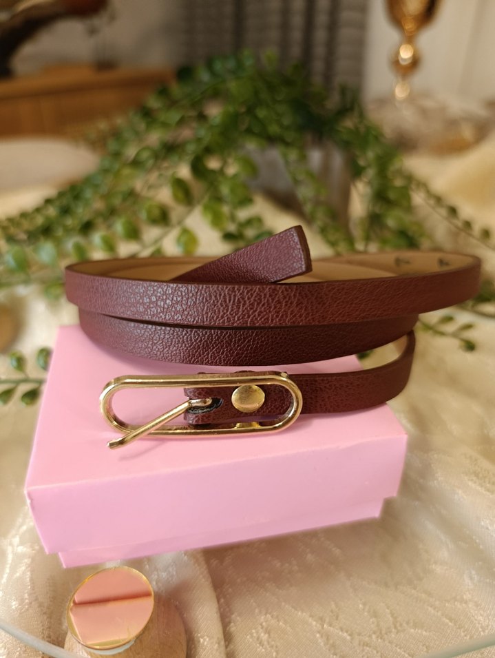 Kadınlar için 4 farklı renk deriden, güvenlik iğnesi şeklinde tokasıyla dikkat çeken bir kemer.