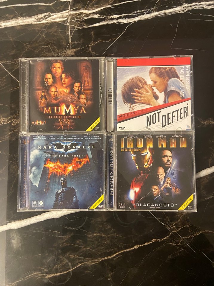 Mumya, Not Defteri, Kara Şövalye ve Iron Man filmlerinin orijinal kapaklı ve orijinal filmlerdir. Tekli alım vardır. Hepsi türkçedir. Hepsi temizdir.