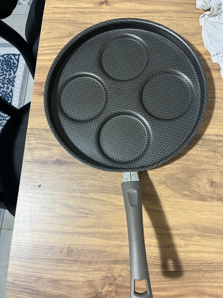 Dört yuvarlak kalıba sahip siyah tava, birden fazla yiyeceği aynı anda pişirmek için uygundur. Dokulu yüzey ve uzun sapı vardır.