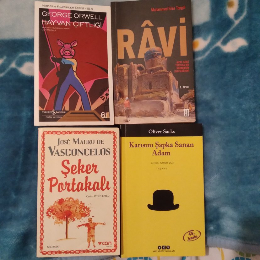 George Orwell'in Hayvan Çiftliği, Râvi, Şeker Portakalı ve Karısını Şapka Sanan Adam kitaplarından oluşan 4'lü set.
