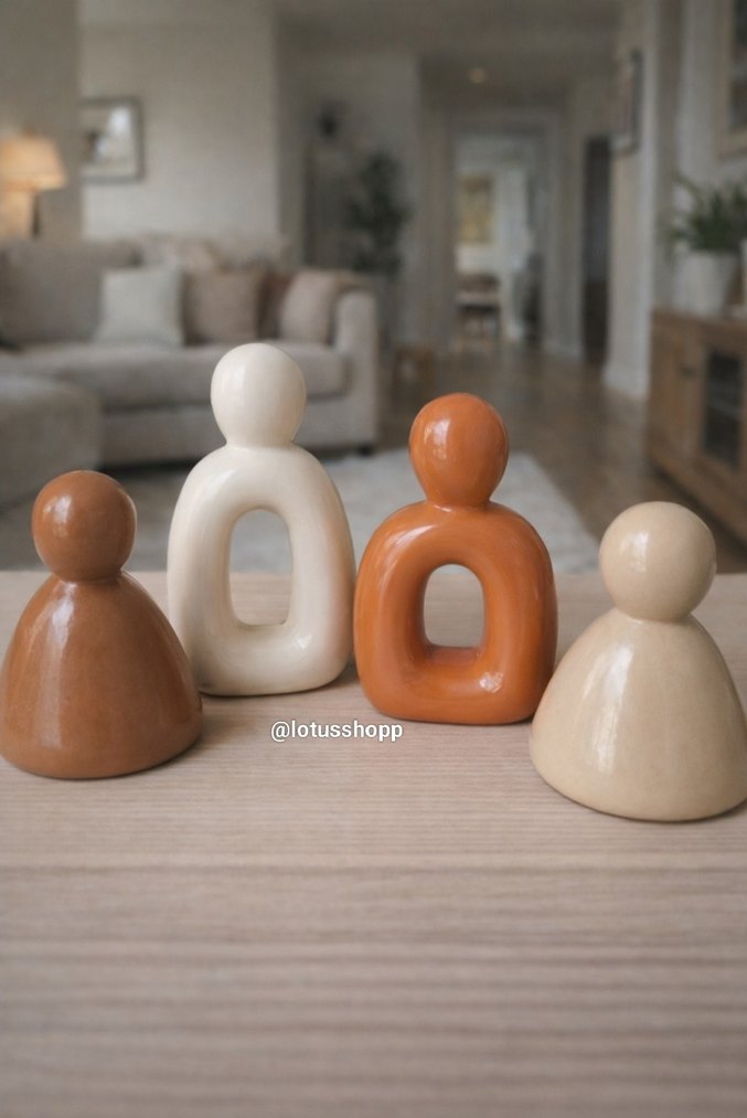 Dört adet pastel camel renginde, yumuşak ve yuvarlak hatlara sahip soyut figürin seti. Dekoratif kullanım için uygundur.