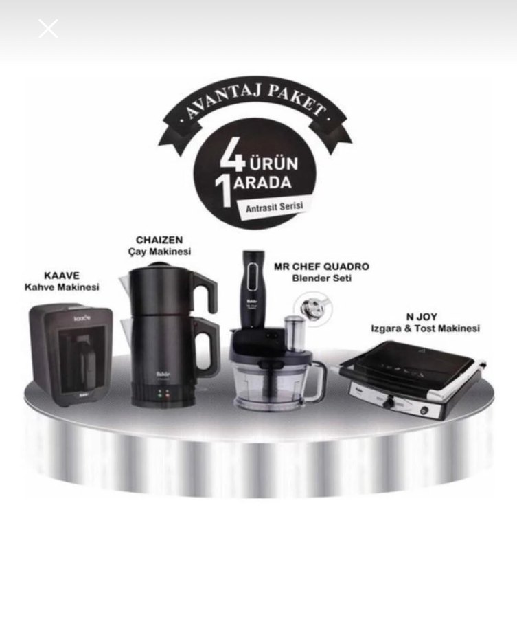 Çeyizime aldım kullanılmadı sıfır set. Antrasit renkli bu mutfak setinde kahve makinesi, çay makinesi, blender seti ve ızgara & tost makinesi bulunur. Çok yönlü kullanım sağlar. ️