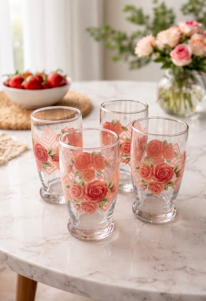Pembe gül desenleriyle süslenmiş, 4'lü bardak seti. Bir kere kullanıldı.