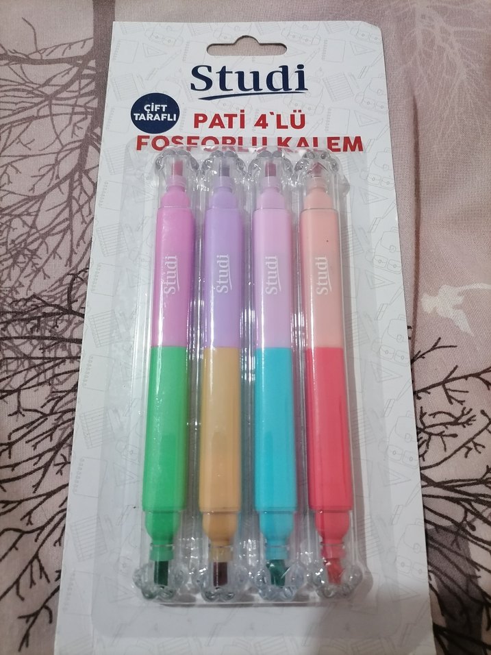 Studi markasına ait 4 renkli pastel tonlarda çift taraflı fosforlu kalem seti. Canlı işaretleme için uygundur. ️