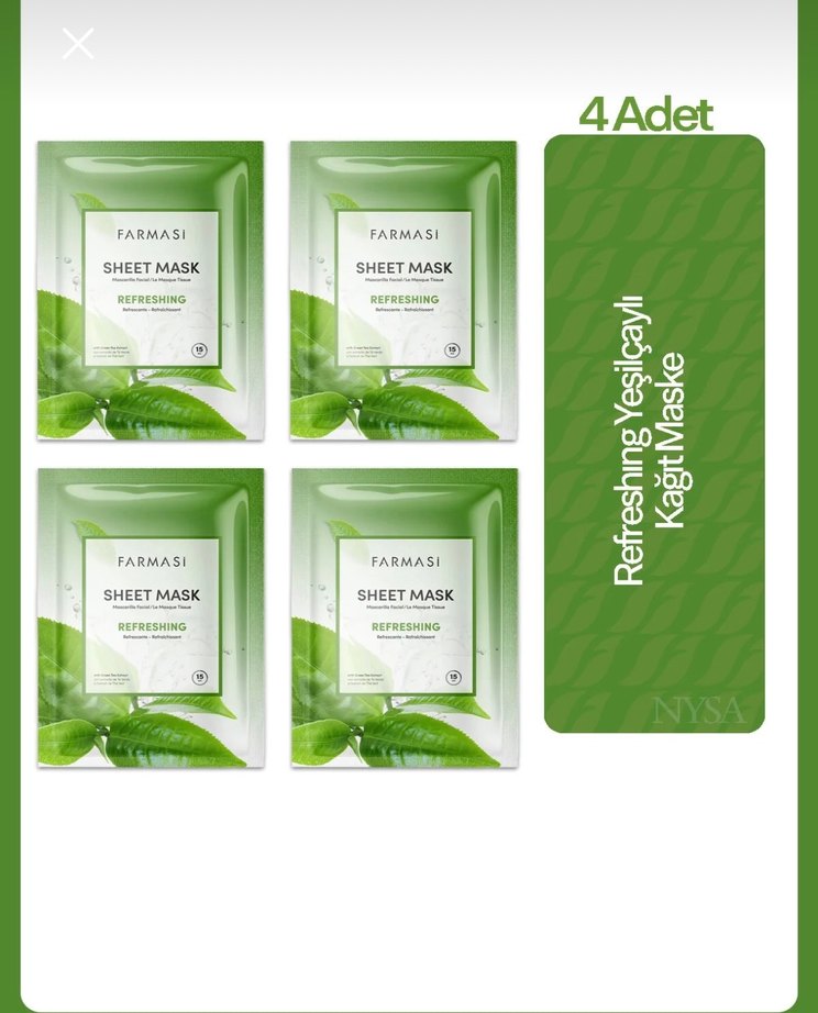 Farmasi markasına ait, yeşil çay özlü, ferahlatıcı 4 adet kağıt maske seti.