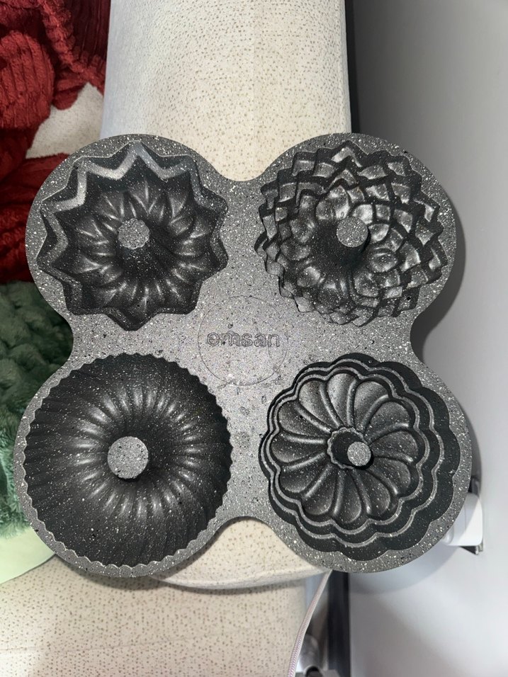 Koyu gri renkte, dört farklı desenli kek kalıbı seti. Kolay çıkarma ve eşit pişirme sağlar. Emsan markalı dökümdür bir kere kullandım hasarsızdır