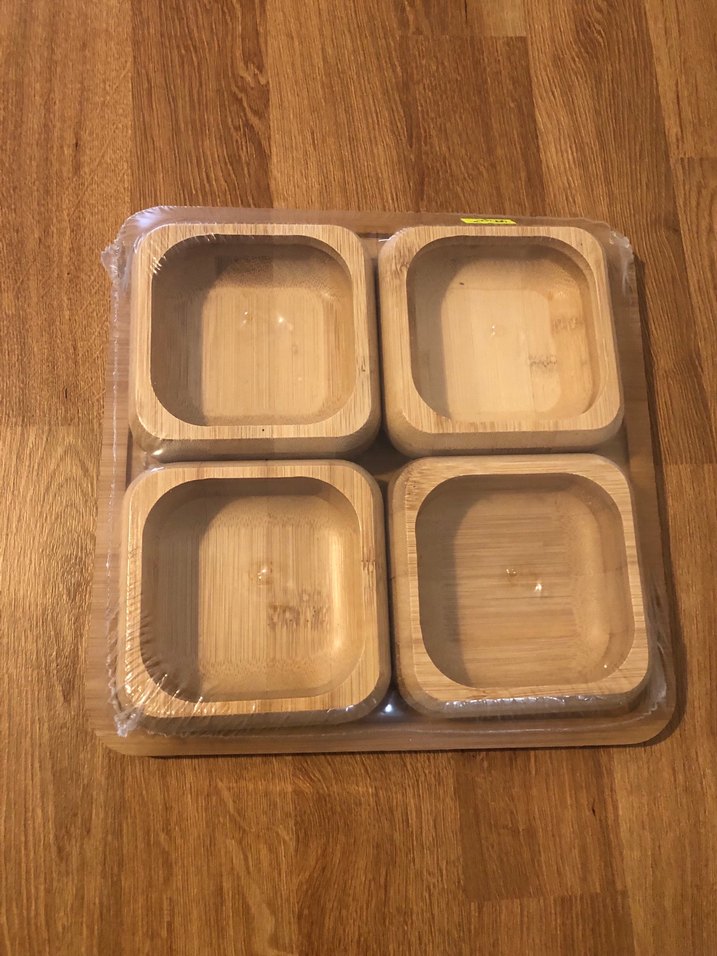 Dört adet kare şeklinde, bej renginde ahşap sunum kabı seti. Pürüzsüz yüzeye sahip, servis veya saklama için uygun. ️
