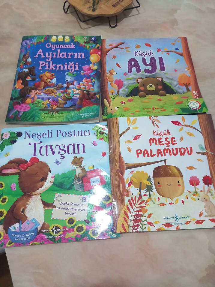 Renkli ve eğlenceli, oyuncak ayılar, küçük ayı, neşeli postacı tavşan ve küçük meşe palamudunu anlatan dört çocuk kitabı seti.
