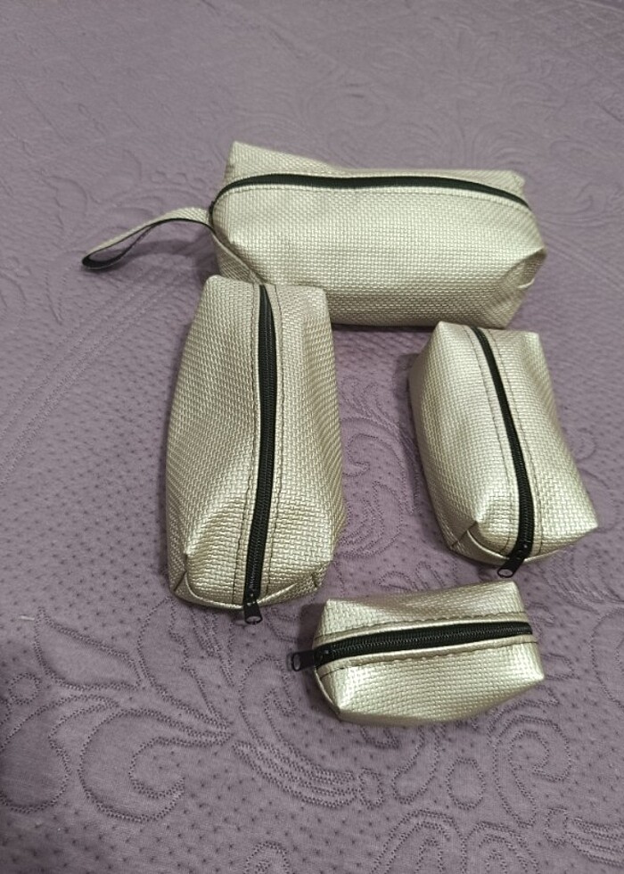 4'lü MAKYAJ ÇANTASI su geçirmez dikişleri sağlam, fermuarları düzgün dür iç kumaşı kalın en büyük 23 cm,bir küçüğü 19 cm, onun küçüğü 15 cm,en küçük 10 cm Uygun fiyat Sıfır üründür iade YOKTUR