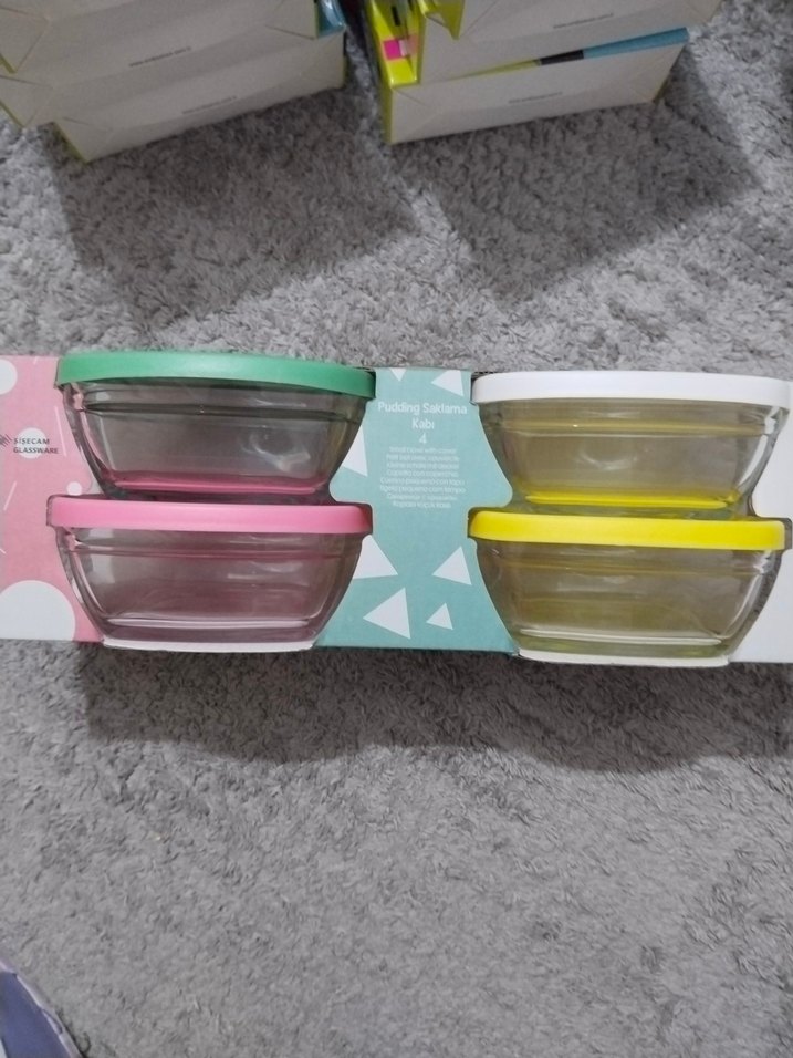 Dört adet yeşil, pembe, beyaz ve sarı pastel renkli kapaklı cam saklama kabı seti. Gıdalar için hava geçirmez saklama sağlar.