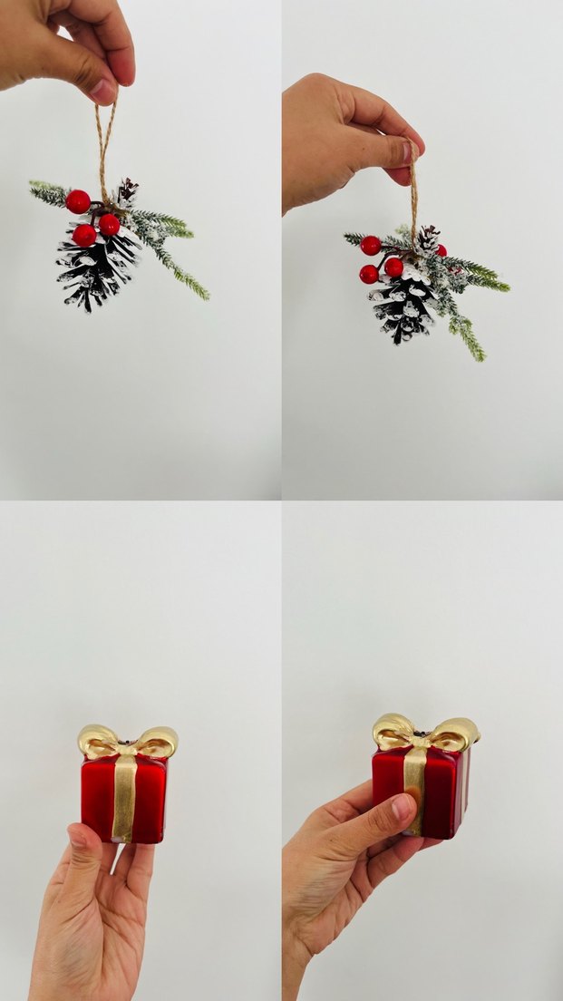 Renkli kırmızı yılbaşı süsleri seti; kozalak, kırmızı meyveler ve altın kurdeleli küçük hediye kutusu içerir.