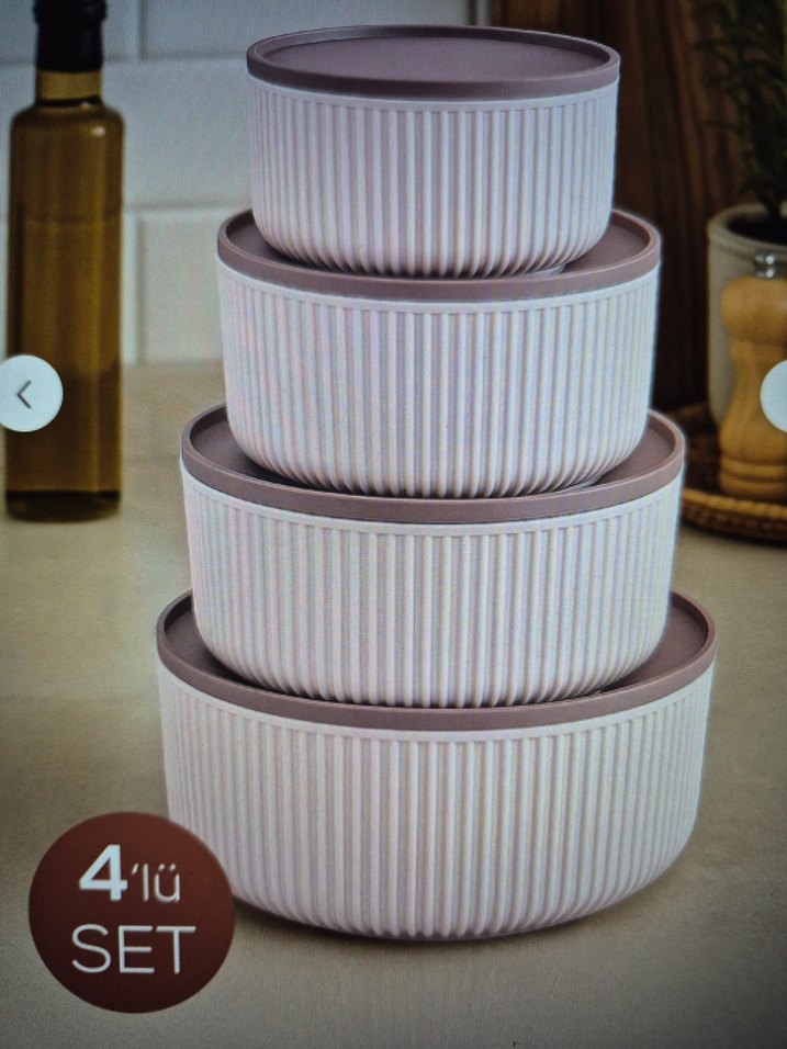 4 lü yuvarlak saklama kabı seti çizgili pembe mikro dalga uyumlu