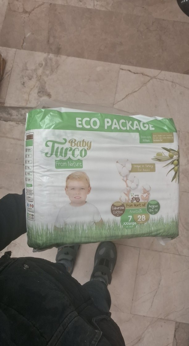 Baby Turco bebek bezleri, doğal pamuk ve zeytinyağı içeren çevre dostu pakette. XXL beden, 28 adet. 1 ADET GÖNDERİLCEK.