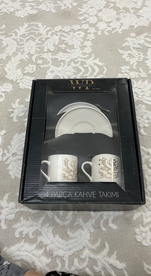 4 parça beyaz kahve fincanı takımı, ince dal desenli ve uyumlu tabaklarla birlikte kahve sunumu için uygundur. ☕ Hediye geldi hiç kullanılmadı
