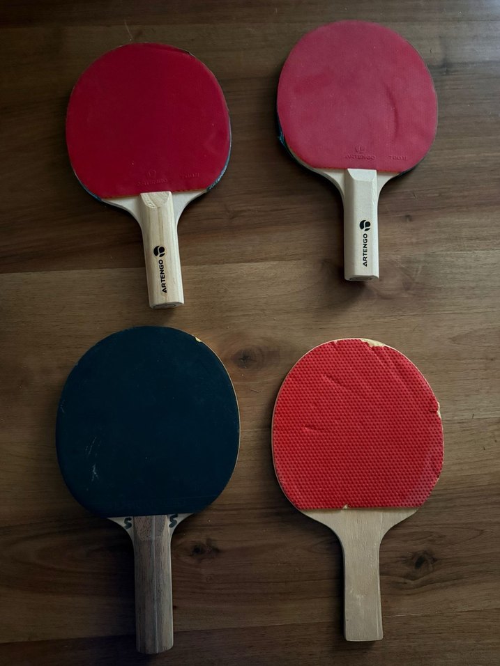 Kırmızı kauçuk yüzeyli ve ahşap saplı dört adet masa tenisi raketi seti.