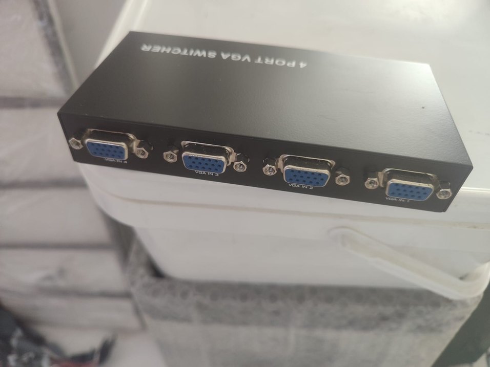 Beyaz detaylı koyu renkli 4 portlu VGA anahtarlayıcı, birden fazla VGA cihazını tek ekrana bağlamaya olanak sağlar.