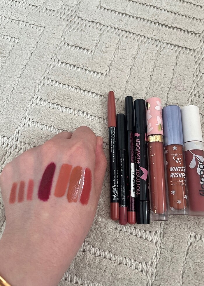 Emily dudak kalemi ve flormar ilk sıradaki ruj hariç hepsi kullanılmamıştır. Kullanılanları fiyata dahil etmedim onları kullanmadığım için hediye olarak göndereceğim #flormar #emily #dudak kalemi #lykd #goldenrose